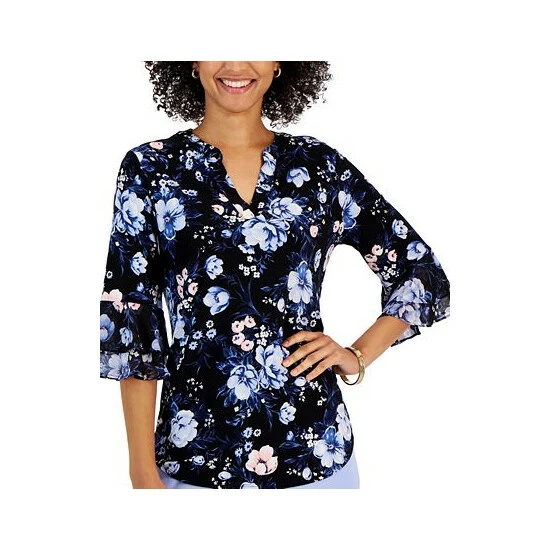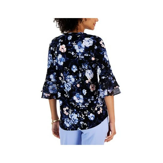 Take your career look in a charming direction with this petite floral-inspired top from Kasper designed with fluttery cuffs.