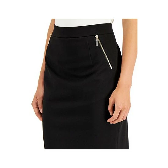 Shiny gold-tone zippered pockets bring practical touches to the professional polish of this petite pencil skirt from Kasper.