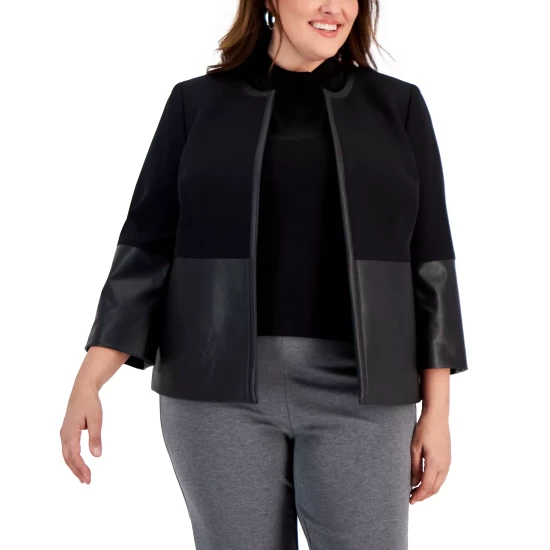 Kasper’s plus size jacket makes an elegant alternative to a cardigan or blazer. Faux leather trim accents the edges and hem.