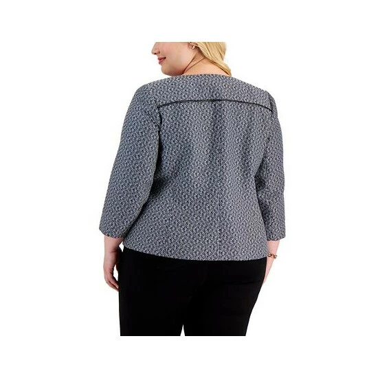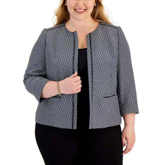 Faux-leather trim lends a stylish finish to Kasper’s plus size tweed jacket.
