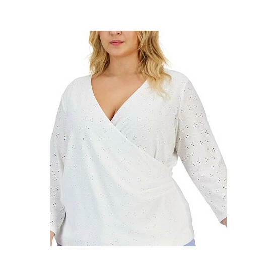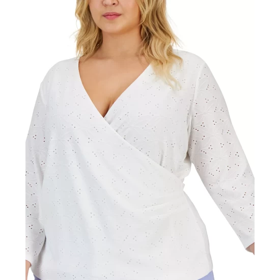 Beautifully embroidered eyelets bring endless style to this plus size faux-wrap top from Kasper, a charming pick finished with 3/4-sleeves.
