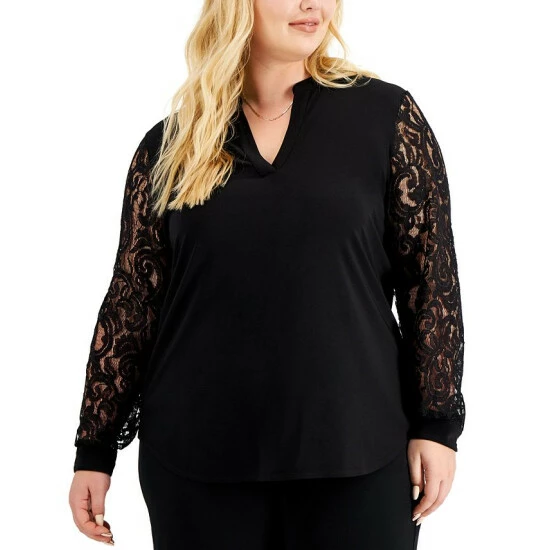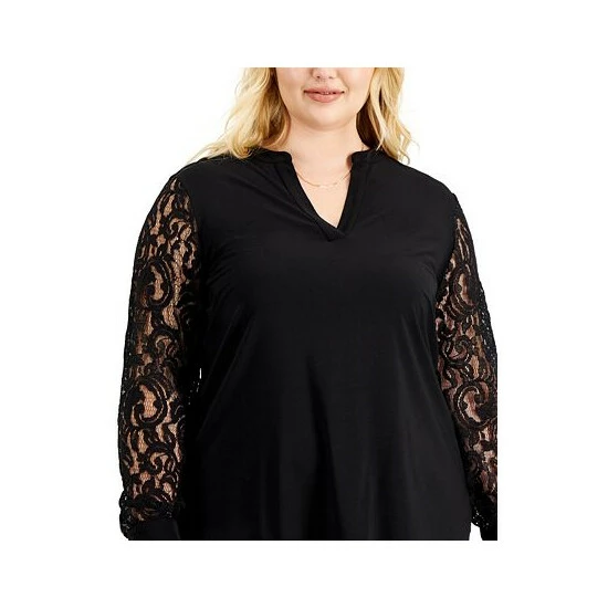 Bring pretty detail to your professional style with this split-neck plus size top from Kasper, framed with lovely lace sleeves.