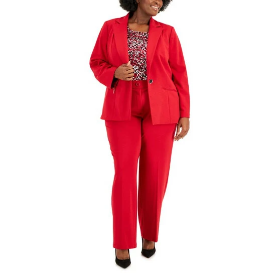 Turn on your brights to power a smart professional look with Kasper’s plus size notched collar jacket and pull-on pants, paired with a vivid geo-print cowlneck top.
