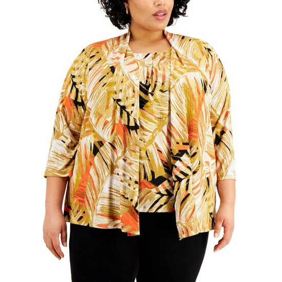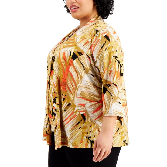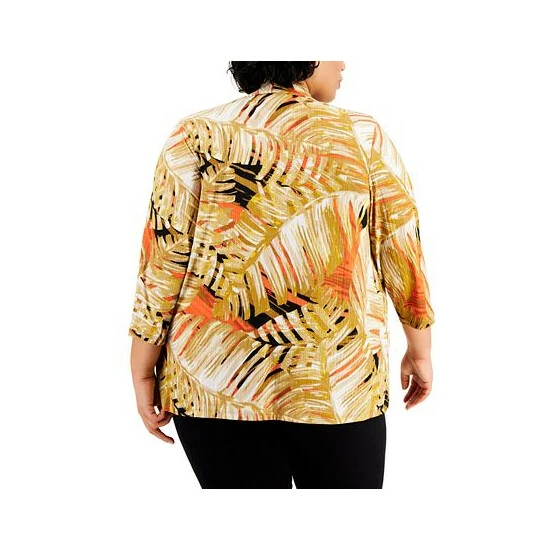 Keep cozy in style during those chilly days in the office with Kasper’s tropical-print, open-front cardigan sweater.