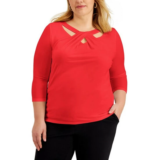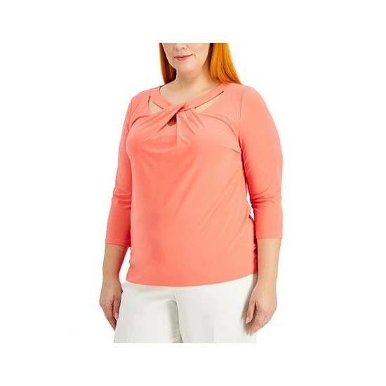 Keep your career look current in this plus size 3/4-sleeve top from Kasper designed with a twisted neckline.