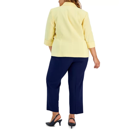 Achieve a flattering work look you’ll want to show off in this plus size ensemble from Kasper, featuring a twist-neck top underneath a 3/4-sleeve blazer and straight-leg pants.