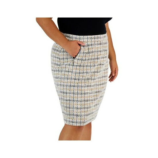 Shiny gold-tone zippered pockets bring practical touches to the professional polish of this plaid plus size pencil skirt from Kasper.