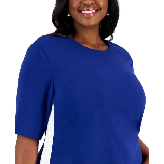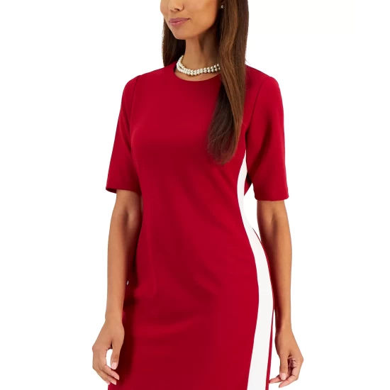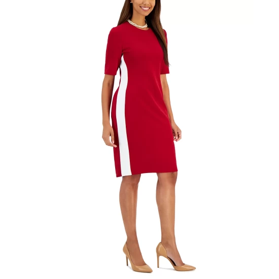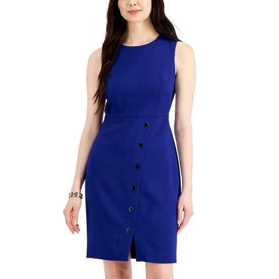 A tailored essential from Kasper, this sleeveless sheath dress features asymmetrical snaps at the front skirt.