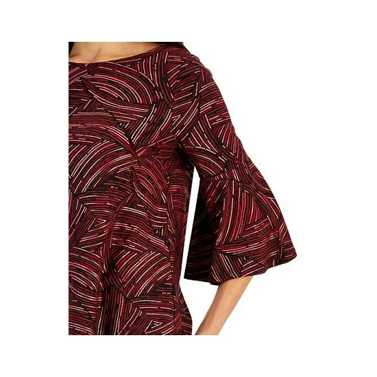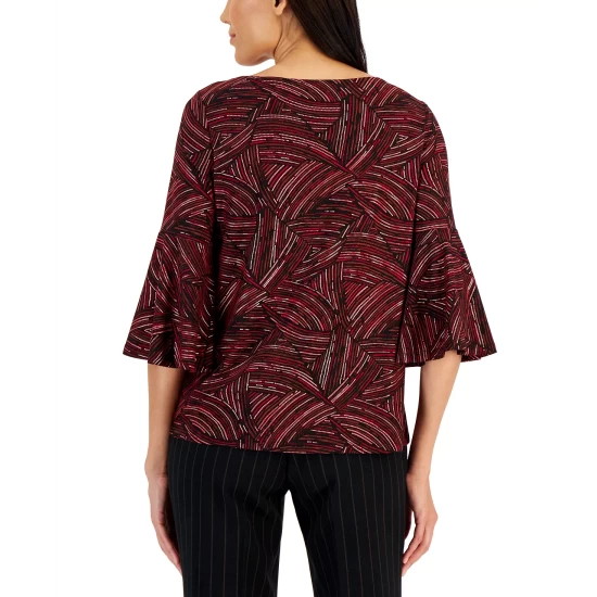 An abstract printed spin on stretch-knit, this career-oriented Kasper top is finished with flowy bell sleeves.