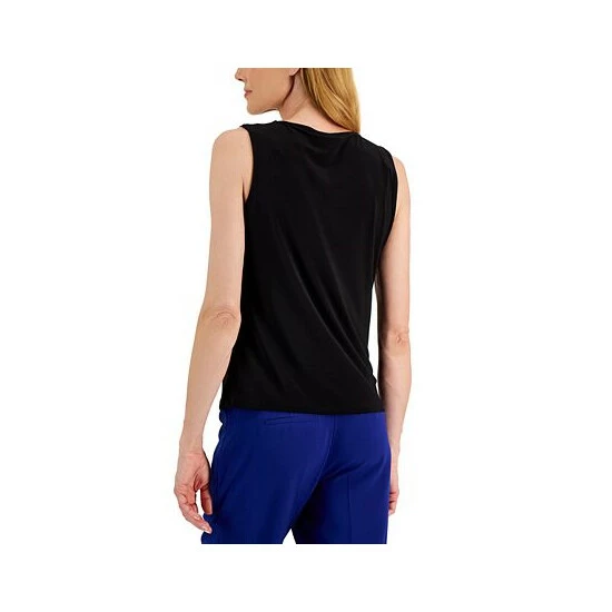 Kasper’s sleeveless career top features a stylishly twisted neckline with sleek faux-leather detail.