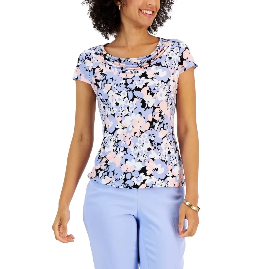 A work-approved pick from Kasper, this short-sleeve top features a beautiful floral print and a cowl neck to match.