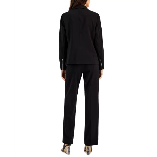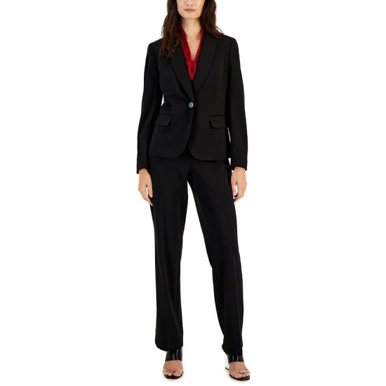 Look your professional best in a cinch with this women’s one-button blazer, coordinated tie-neck top and pants from Kasper. A must-have trio for any chic closet.