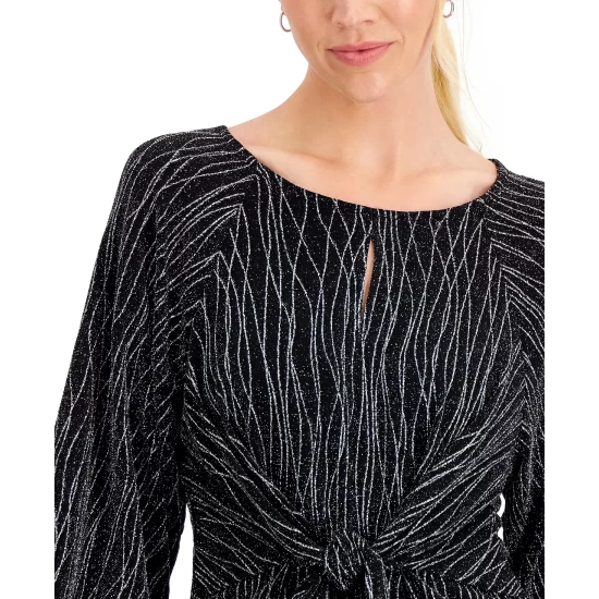 A bold brushstroke-inspired print brightens workdays in this pleated-neck knit top from Kasper. A silver-tone hardware finish at the center keyhole adds a touch of flash.