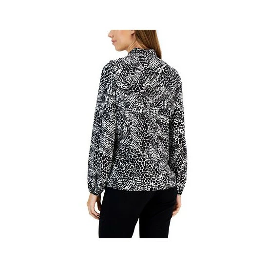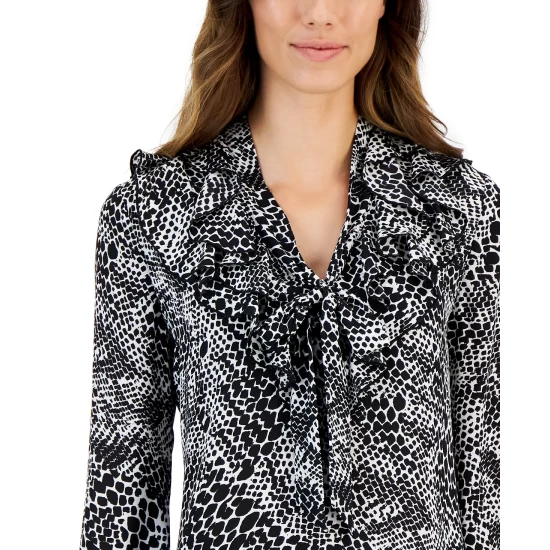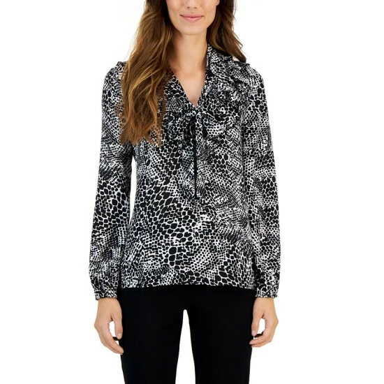 Tied with a bow and trimmed with two tiers of ruffles, this Kasper top in a reptile-inspired print adds striking style to workday wear.